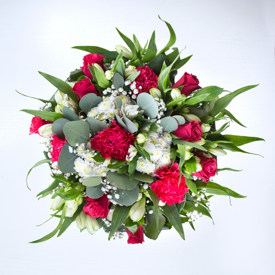 Immerse yourself in the beauty and uniqueness of our exquisite bouquet. This stunning arrangement showcases vibrant red roses, elegant white chrysanthemums, delicate gypsophila, and charming carnations, beautifully complemented by white alstroemeria and lush aspidistra leaves.