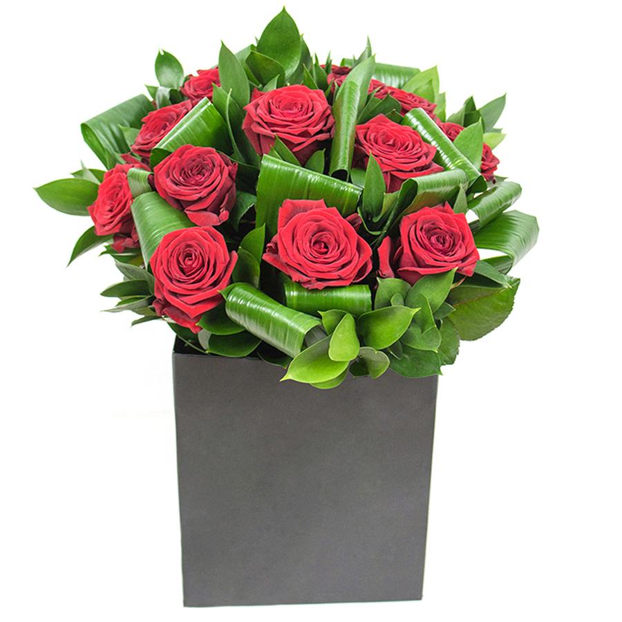 Our refined bouquet showcases the elegant beauty of red roses paired with aspidistra leaves and ruscus. This unique arrangement is perfect for adding grace and sophistication to any home or event.